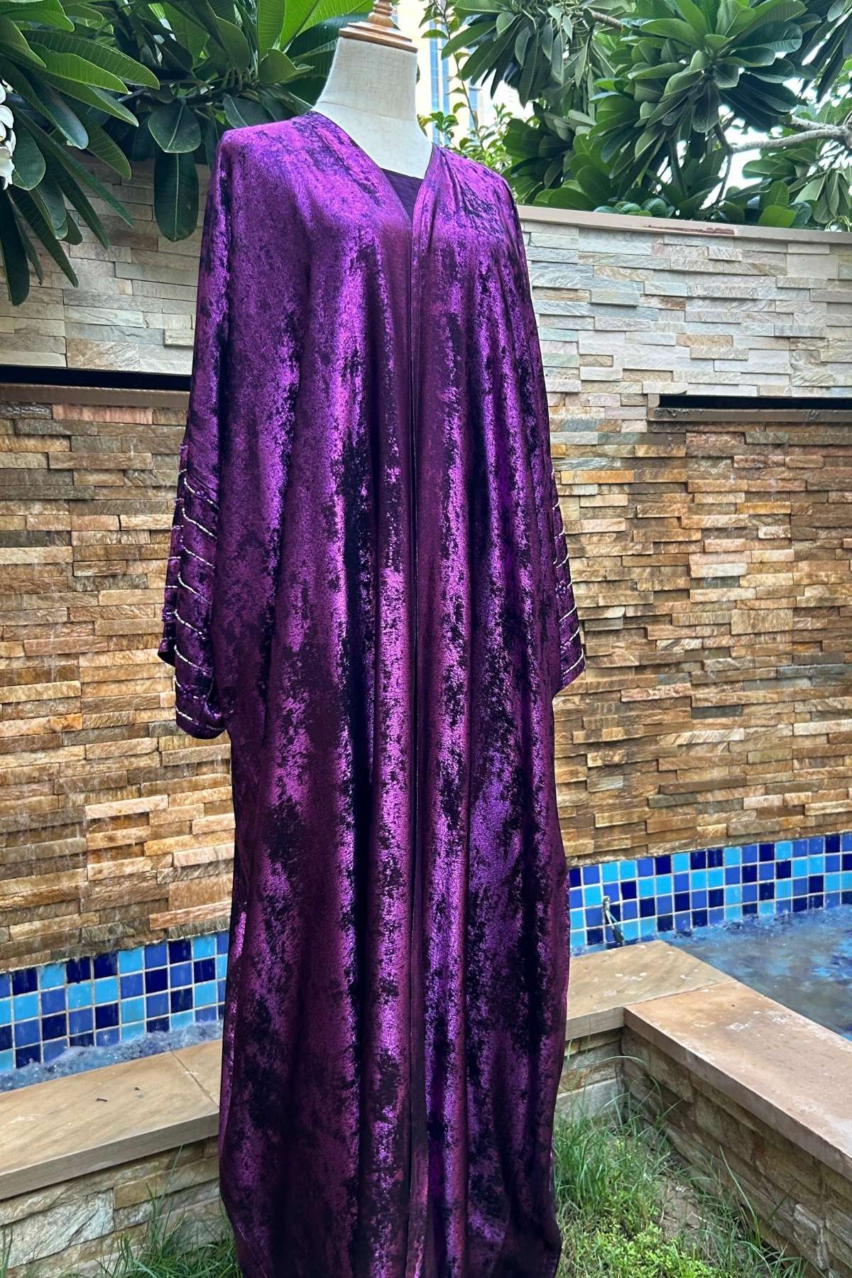 The sleeves feature a delicate floral design, hand-crafted using glass rhinestones and Czech glass cylindrical tubes, arranged over fine stitched pattern lines. Each embellishment is carefully matched to the shade of the abaya, adding refined sparkle, texture, and depth without overpowering the elegant, flowy silhouette.