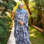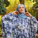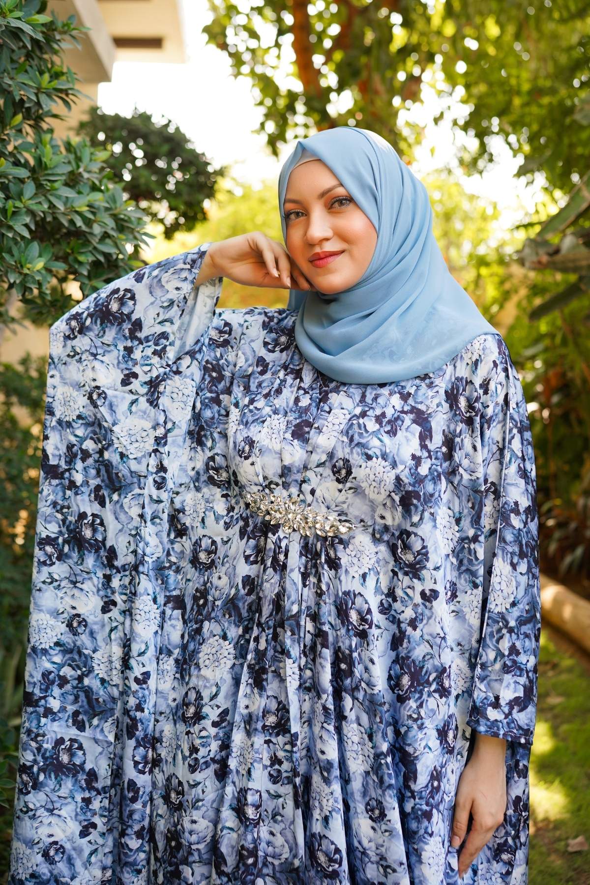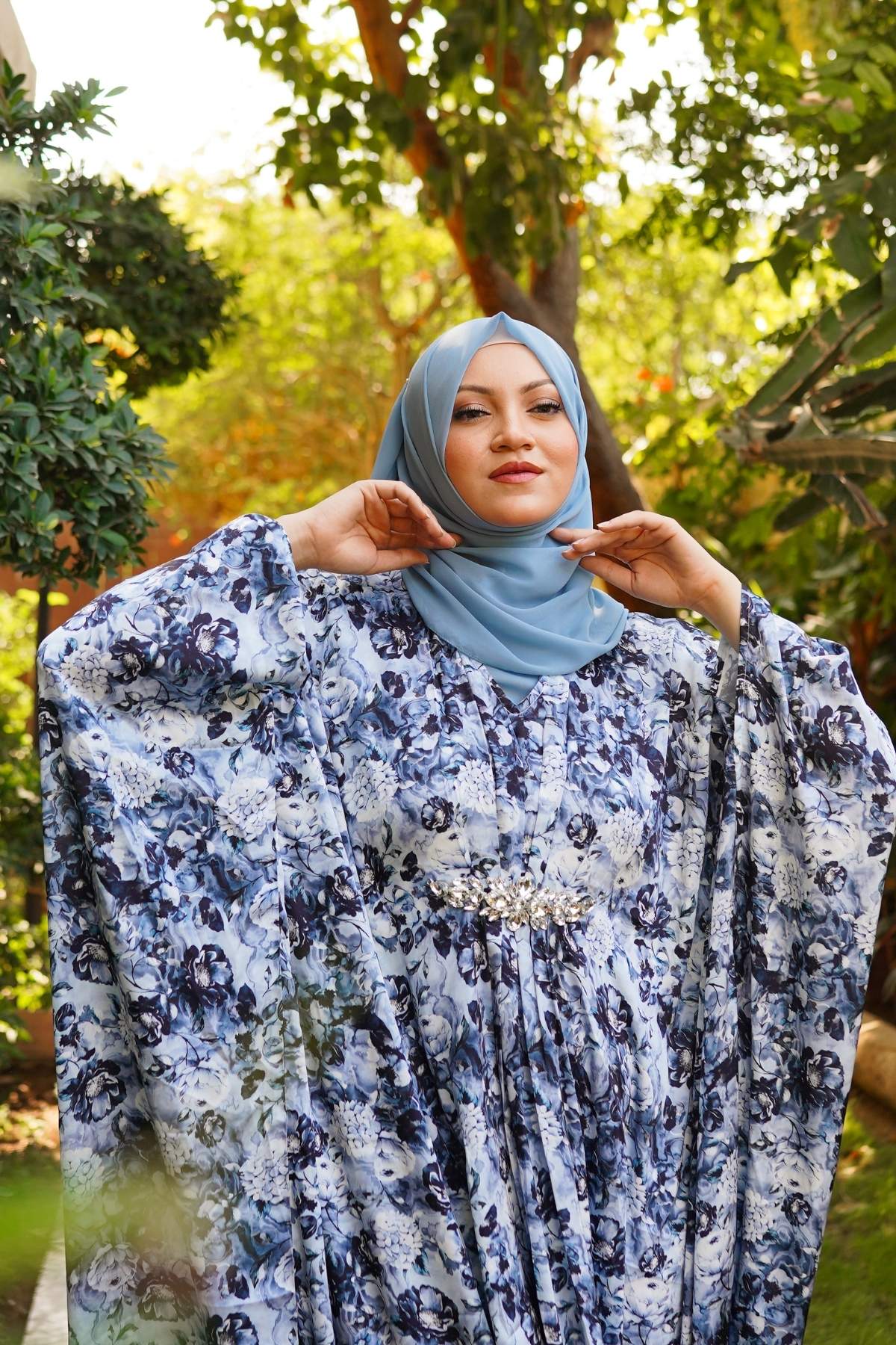 Each kaftan is paired with a custom hand-dyed hijab, dyed to complement the exact tones of its print.