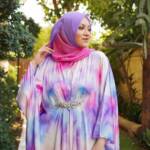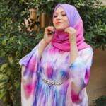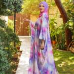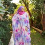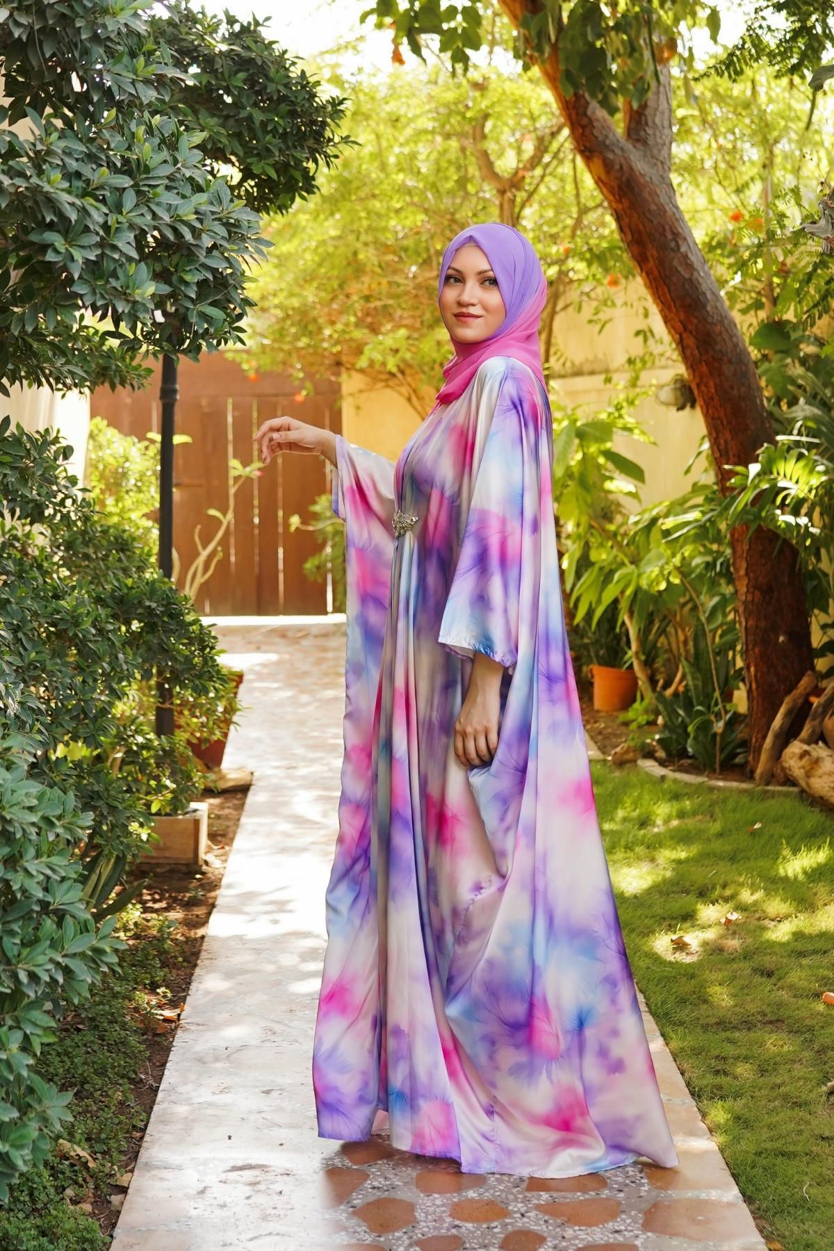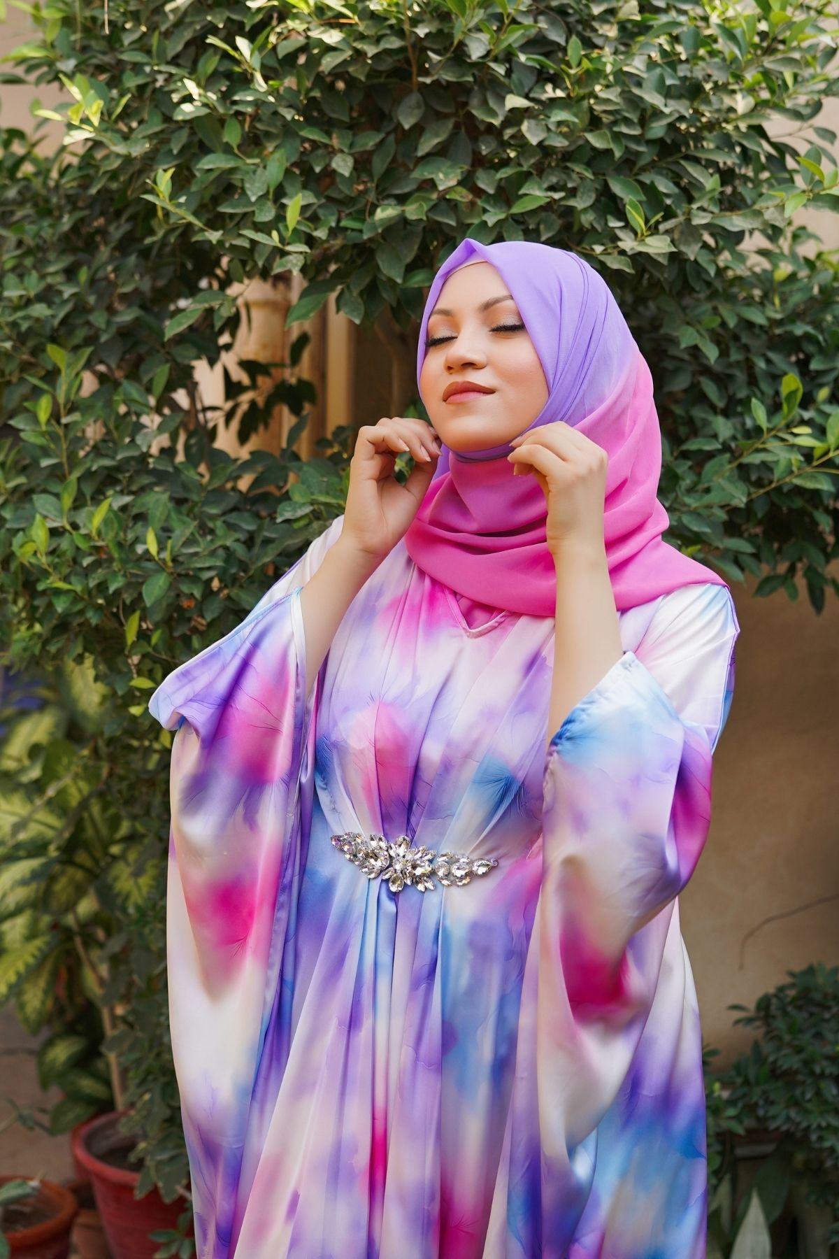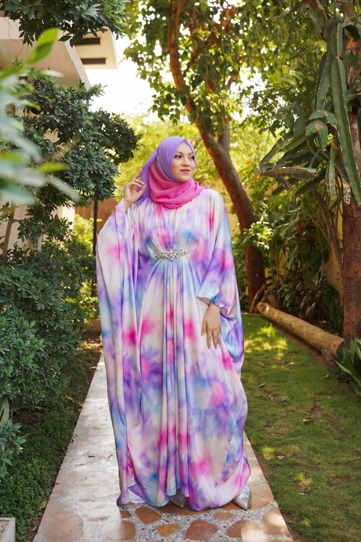 Each kaftan is paired with a custom hand-dyed hijab, dyed to complement the exact tones of its print.