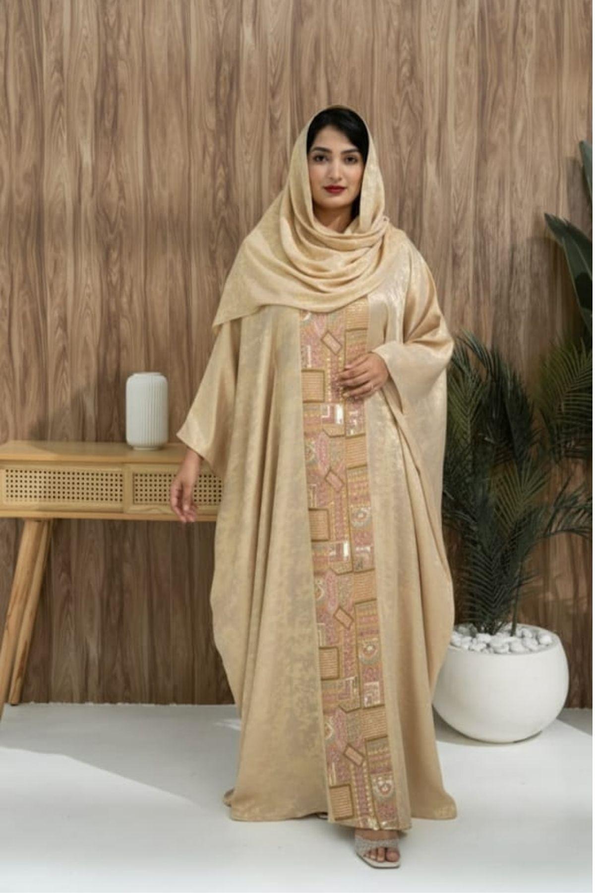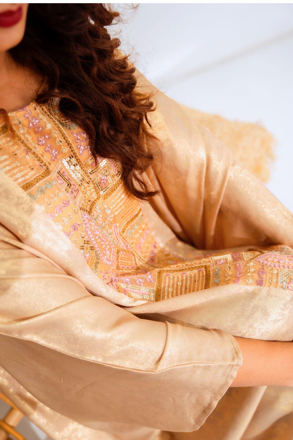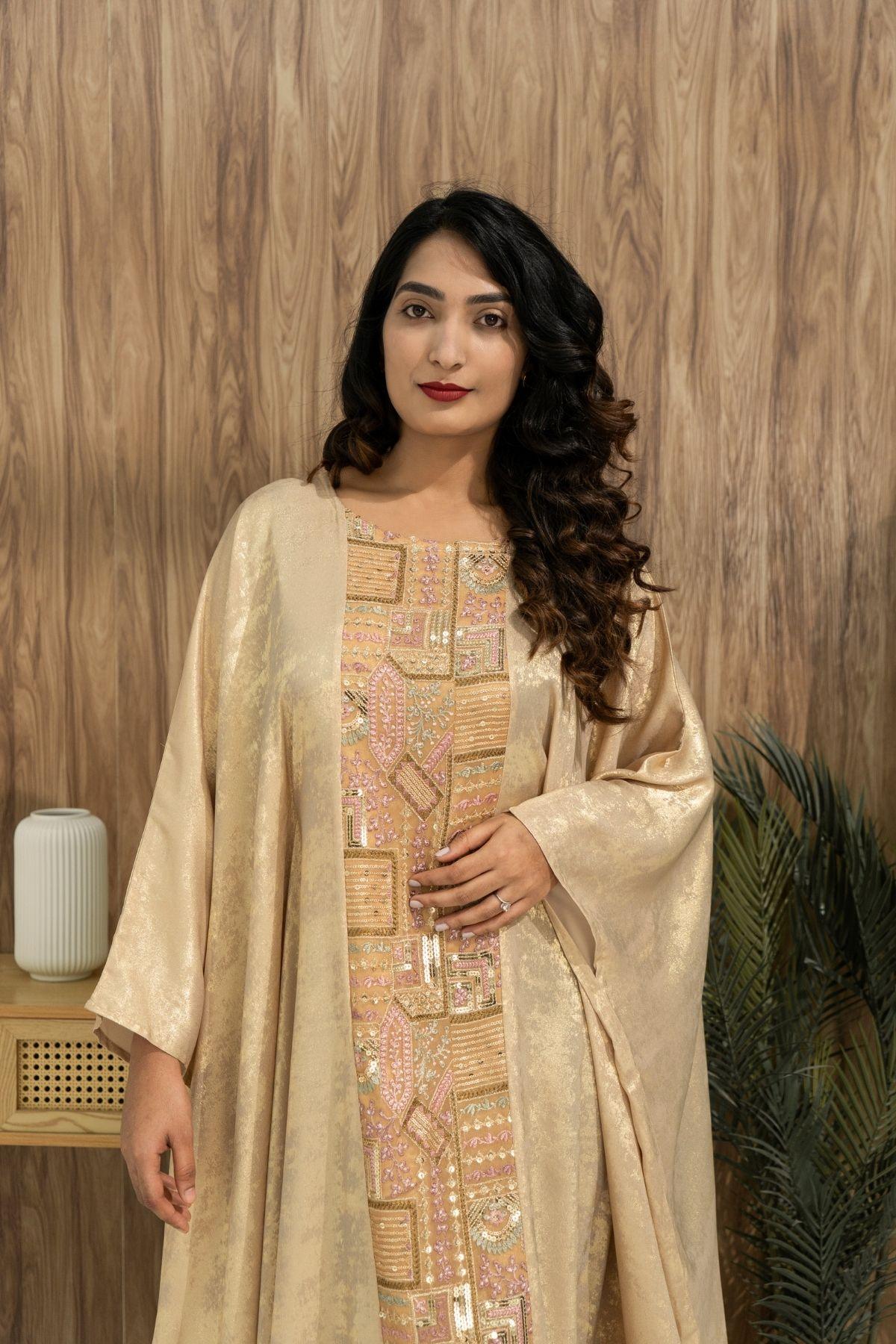 Perfect for weddings, dholkis, dinners, Eid occasions, and celebratory gatherings. Style it with gold heels, statement earrings, or nude accessories to elevate the kaftan’s radiant golden glow.
