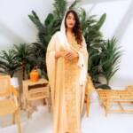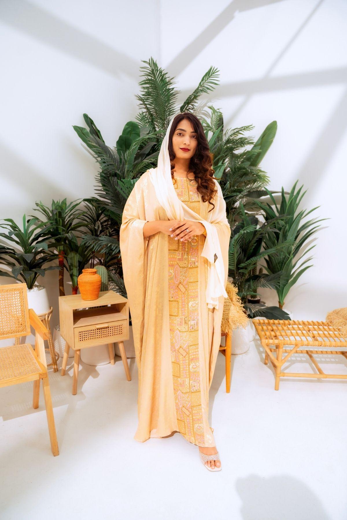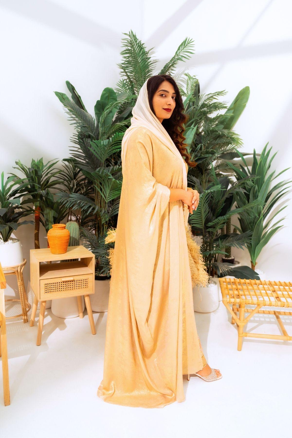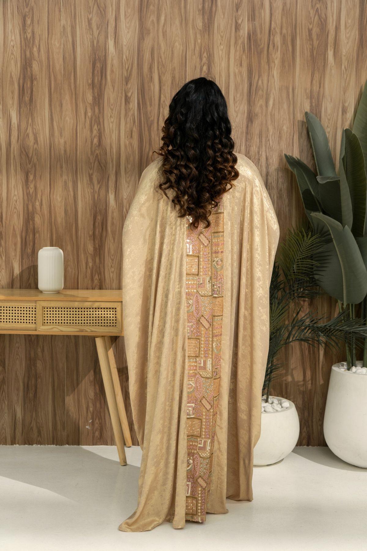 Perfect for weddings, dholkis, dinners, Eid occasions, and celebratory gatherings. Style it with gold heels, statement earrings, or nude accessories to elevate the kaftan’s radiant golden glow.