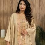 The embroidered panel in complementary tones adds richness and cultural artistry, enhancing the golden shine with a beautifully festive touch.
