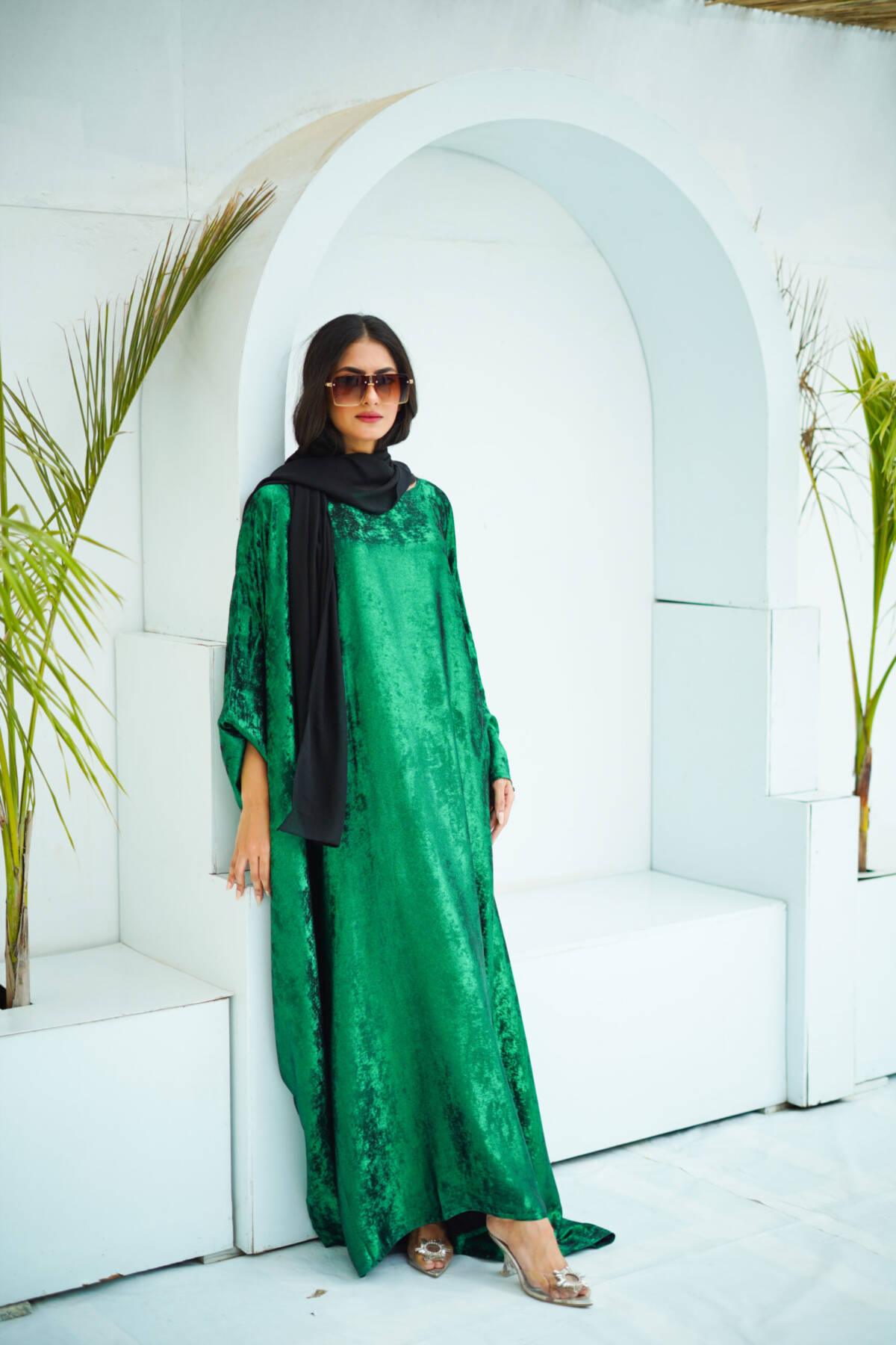 The Luxury Kaftan in Emerald is a celebration of timeless beauty, subtle shimmer, and powerful grace. Designed for the woman who commands elegance effortlessly.
