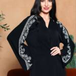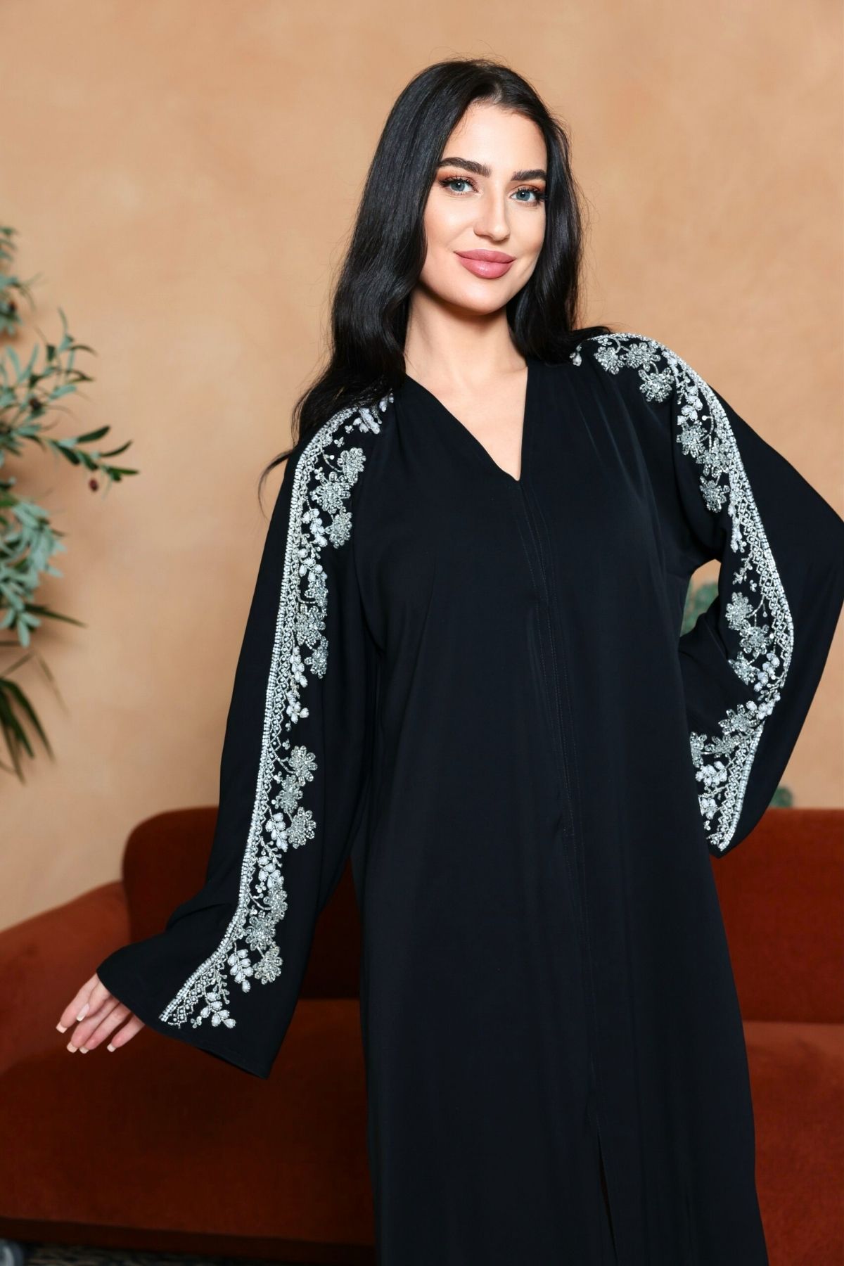 The sleeves are adorned with fine floral embellishments inspired by pearls and silver threadwork, creating a graceful, feminine design that enhances the abaya without making it heavy.