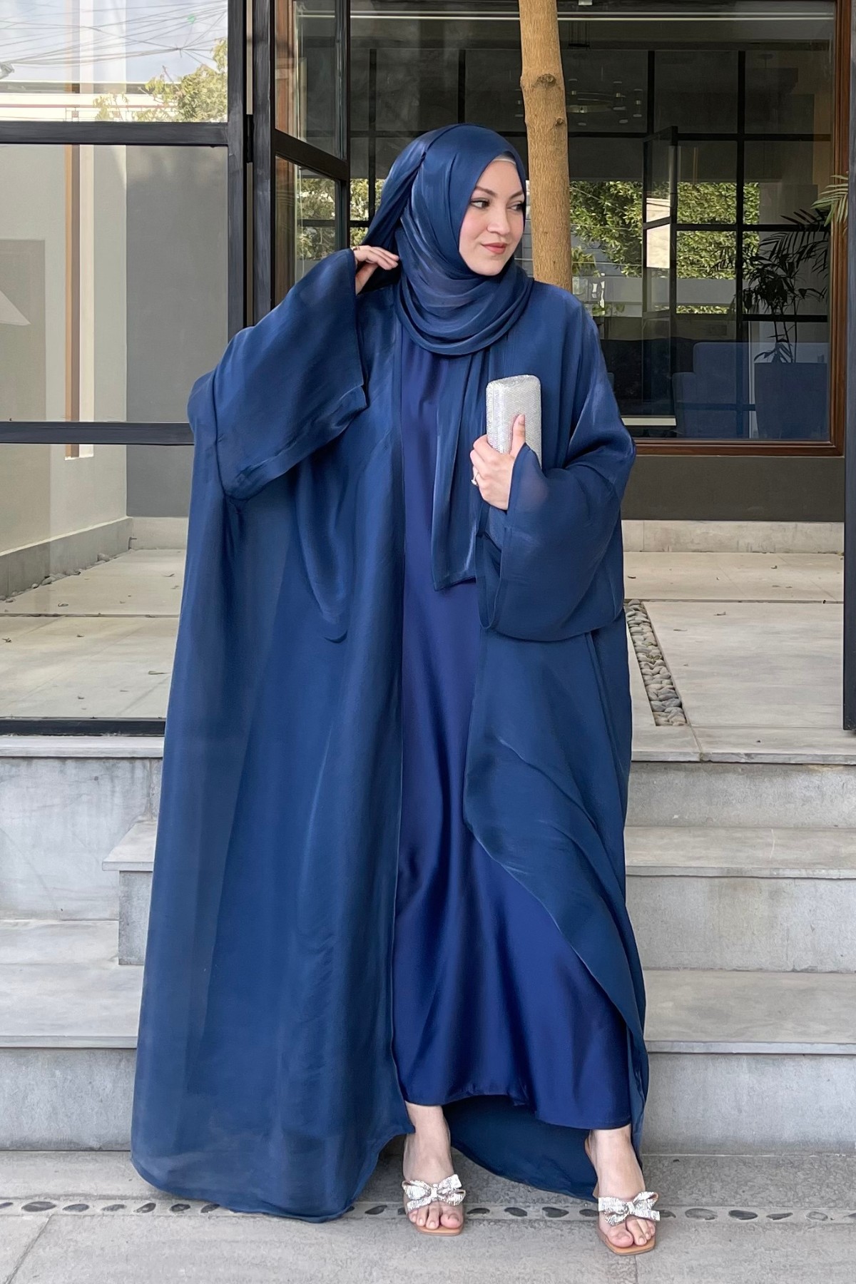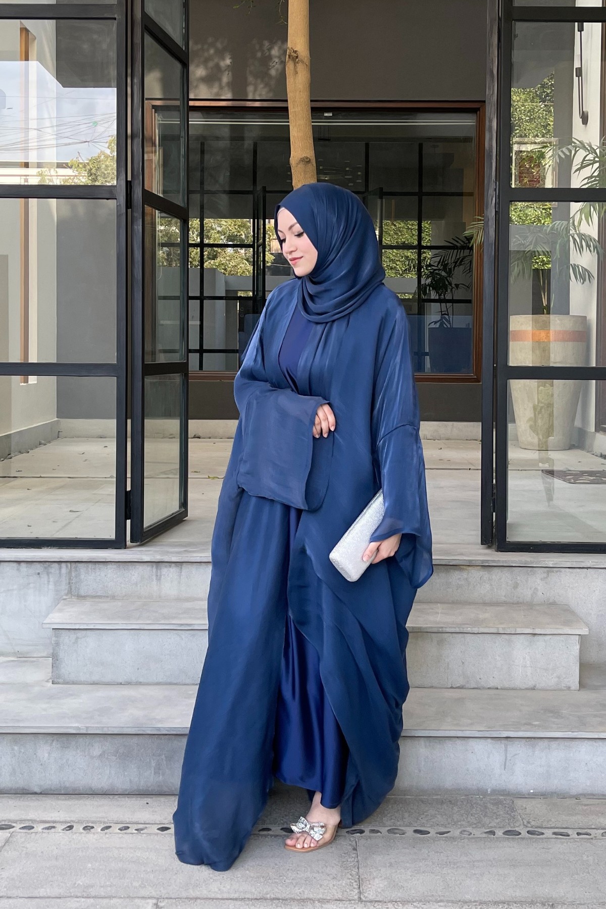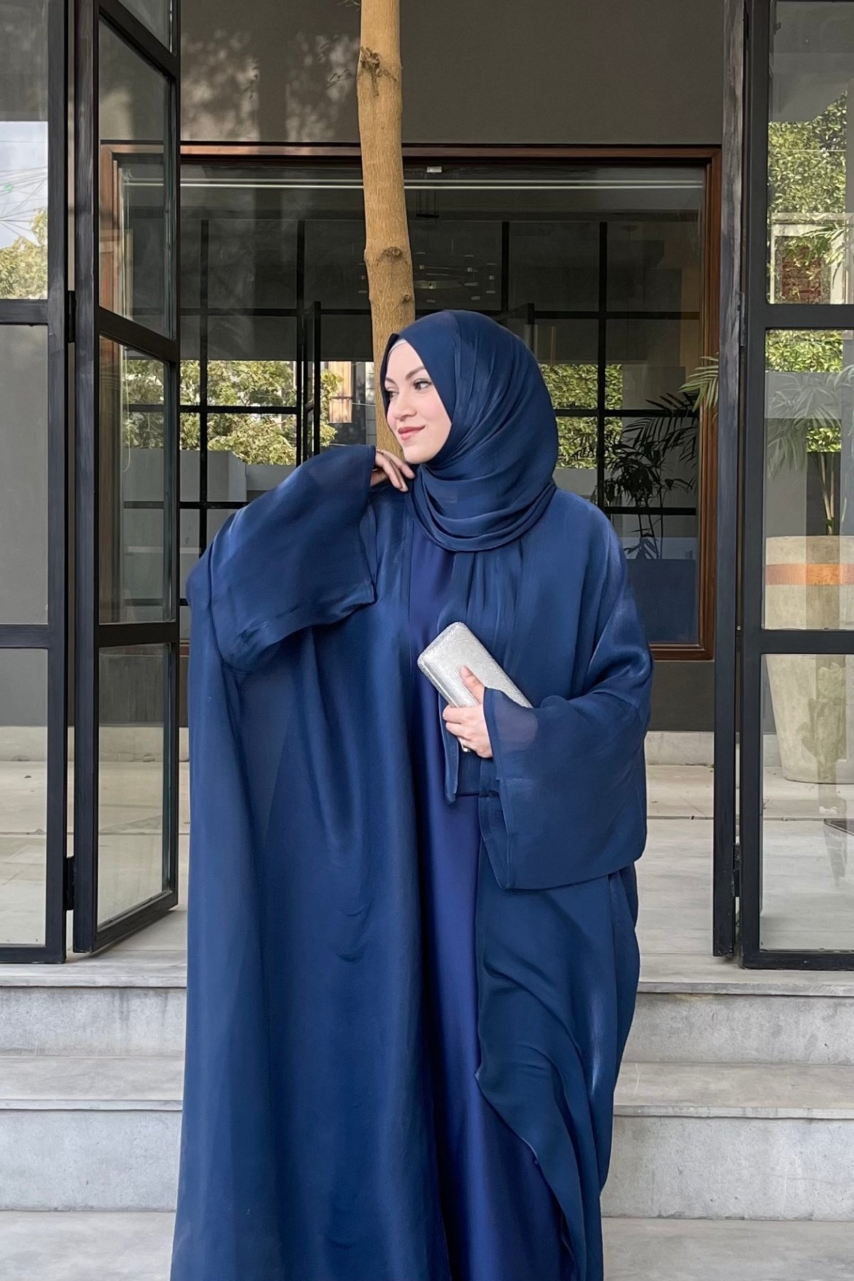 Crafted in rich, shimmery blueberry hues, this abaya reflects quiet grandeur. Its fluid drape enhances every gesture, creating a graceful and refined silhouette.