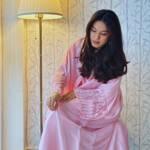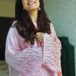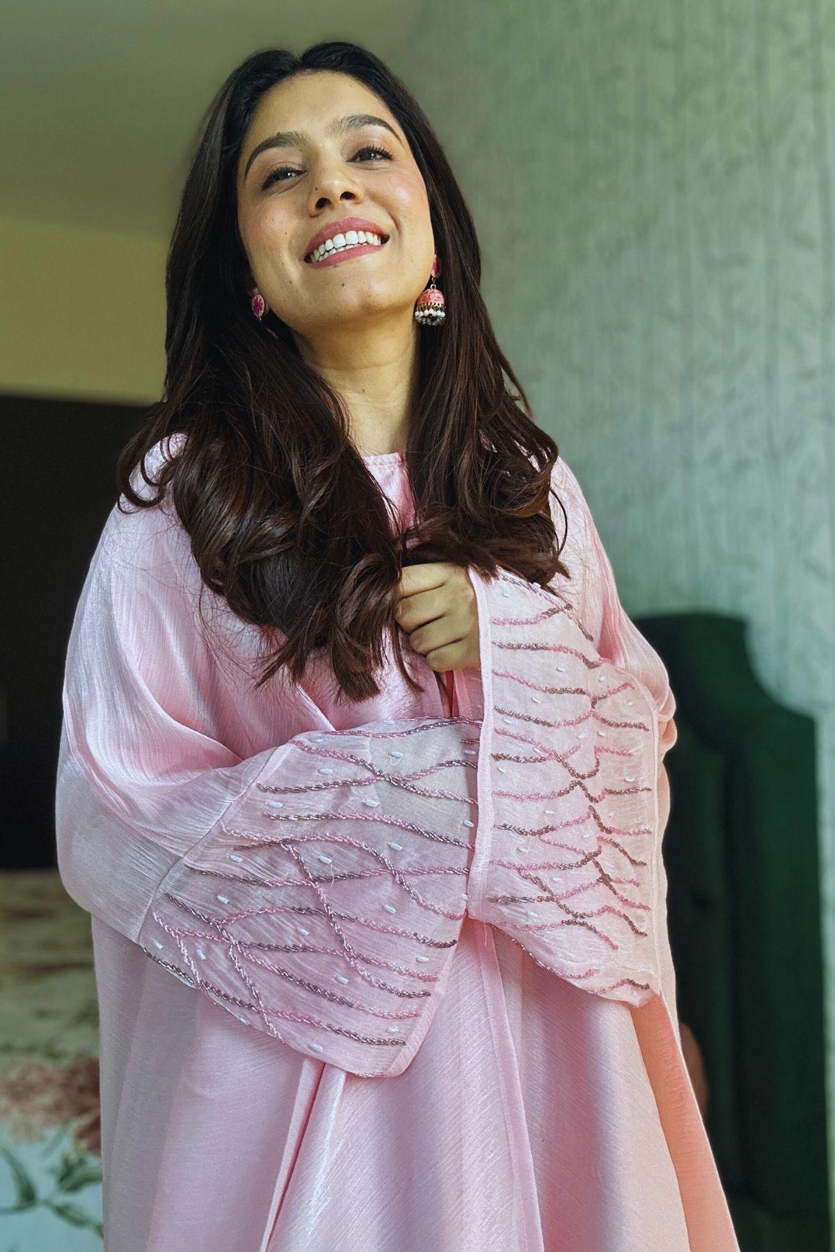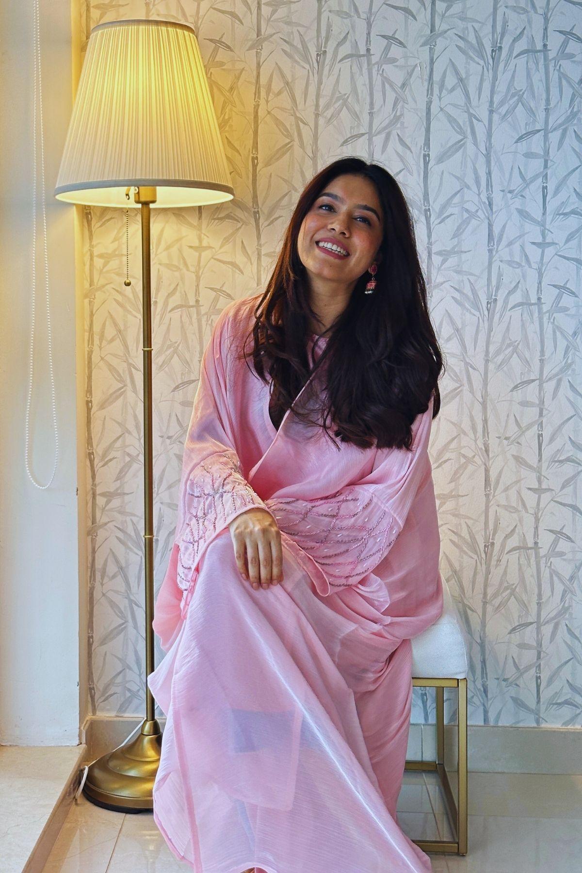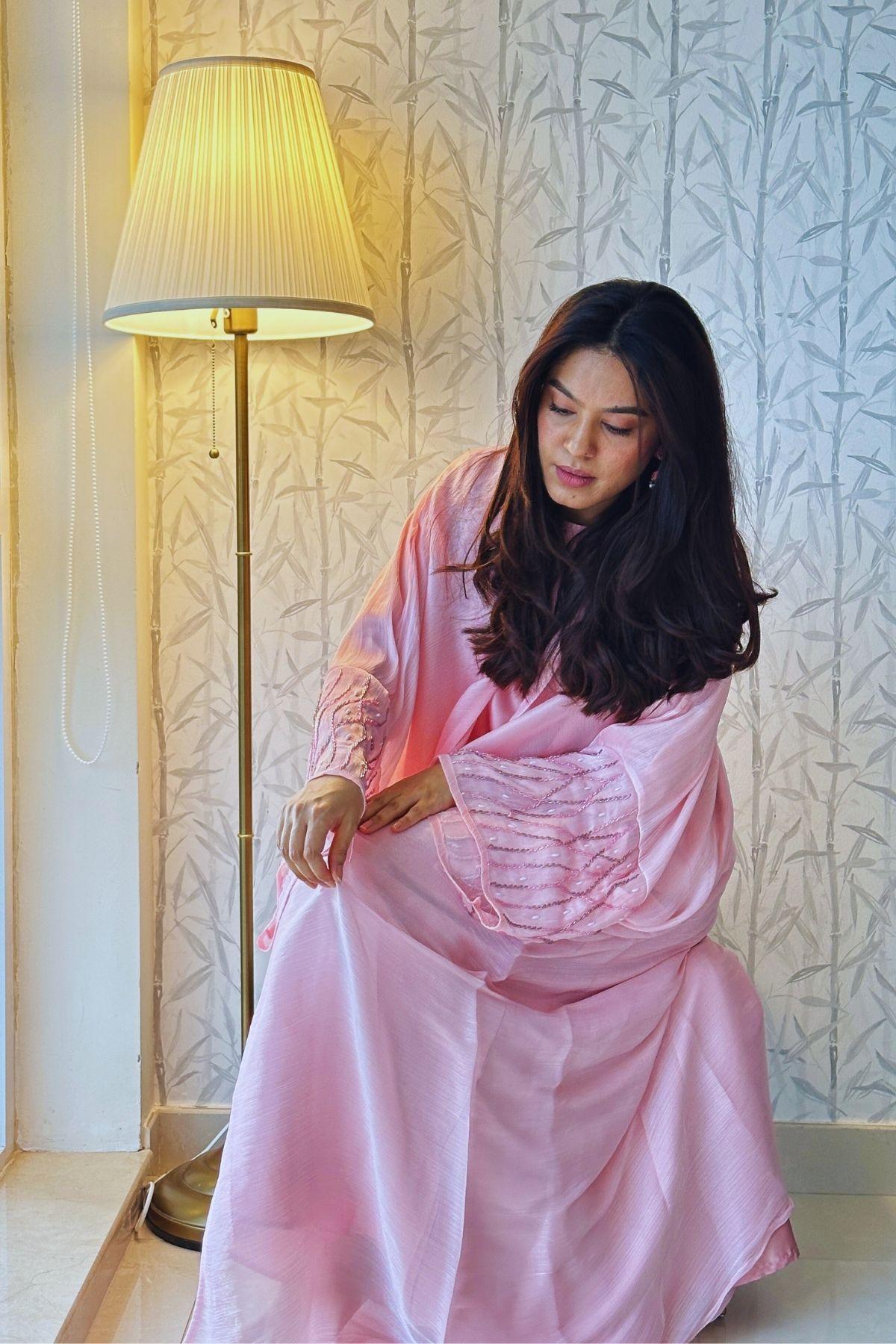 The statement sleeves are adorned with delicate bead and thread embellishments, adding sparkle and dimension while perfectly complementing the Barbie-pink hue.