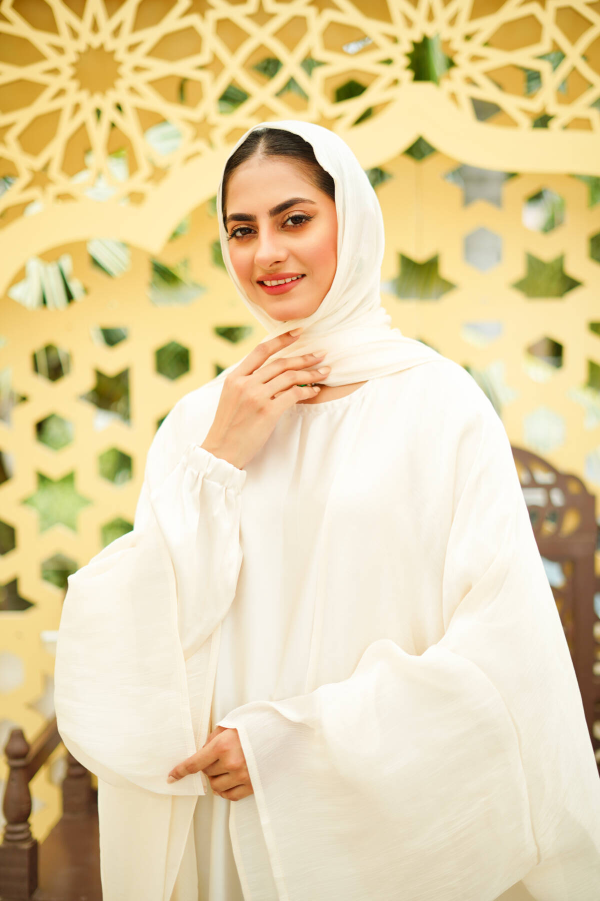 Timeless Elegance: Crafted in pristine pearl white, this abaya embodies the quiet grandeur of royalty. The fluid drape enhances every movement, turning even the simplest gesture into poetry.