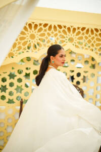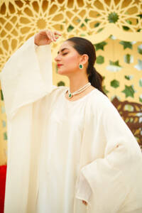 Timeless Elegance: Crafted in pristine pearl white, this abaya embodies the quiet grandeur of royalty. The fluid drape enhances every movement, turning even the simplest gesture into poetry.