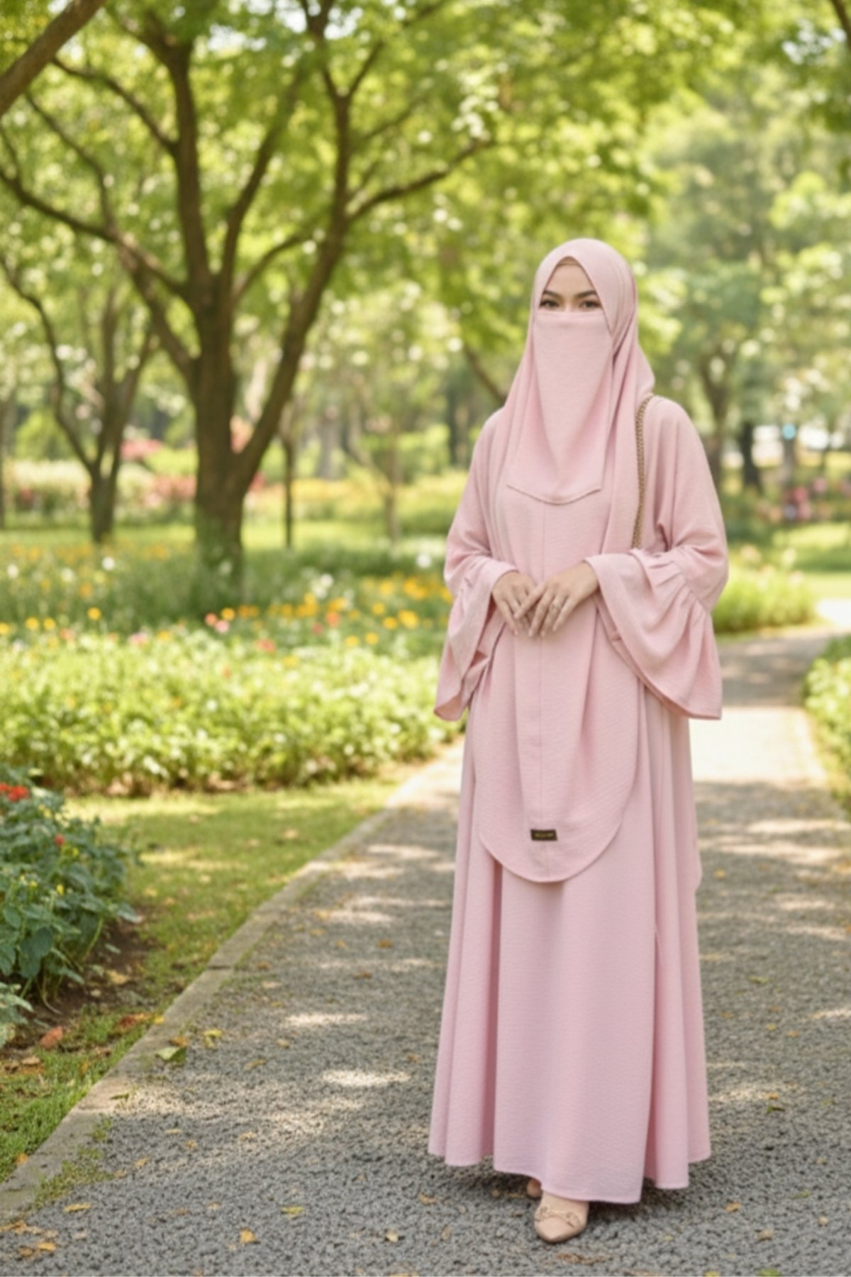 The flowing bell sleeves create a graceful, modest silhouette with effortless movement.