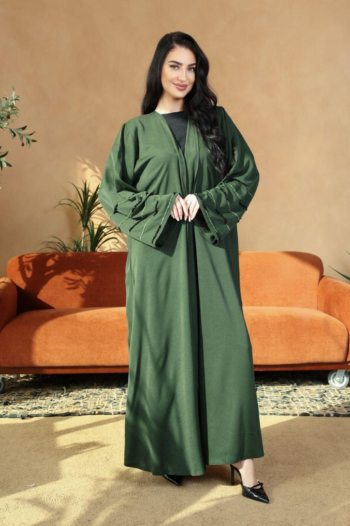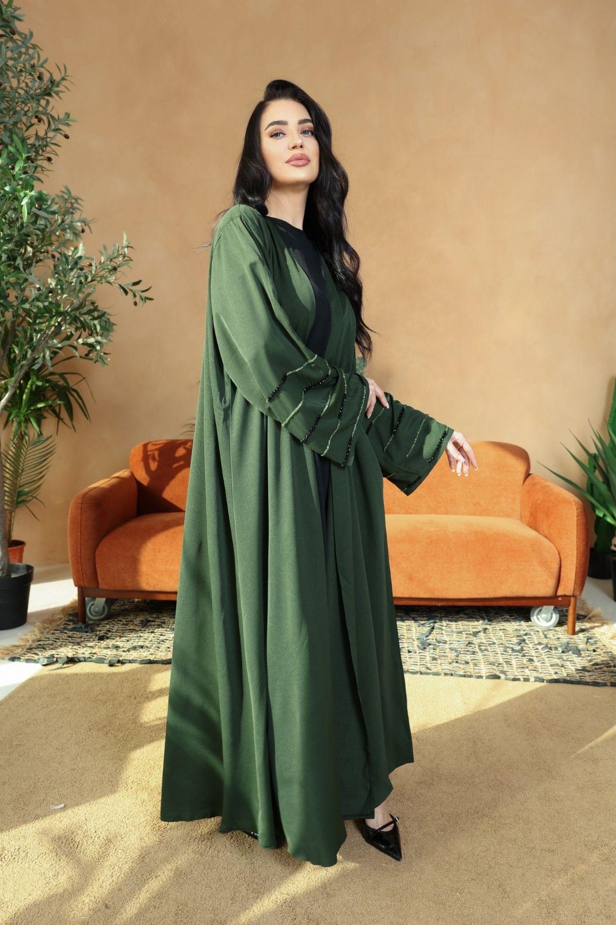 The sleeves feature delicate black beadwork and stitched detailing, adding a soft sparkle and texture that ties beautifully with the black hijab and inner. The embroidery elevates the abaya with a subtle sparkle without taking away from its earthy charm.