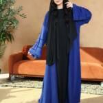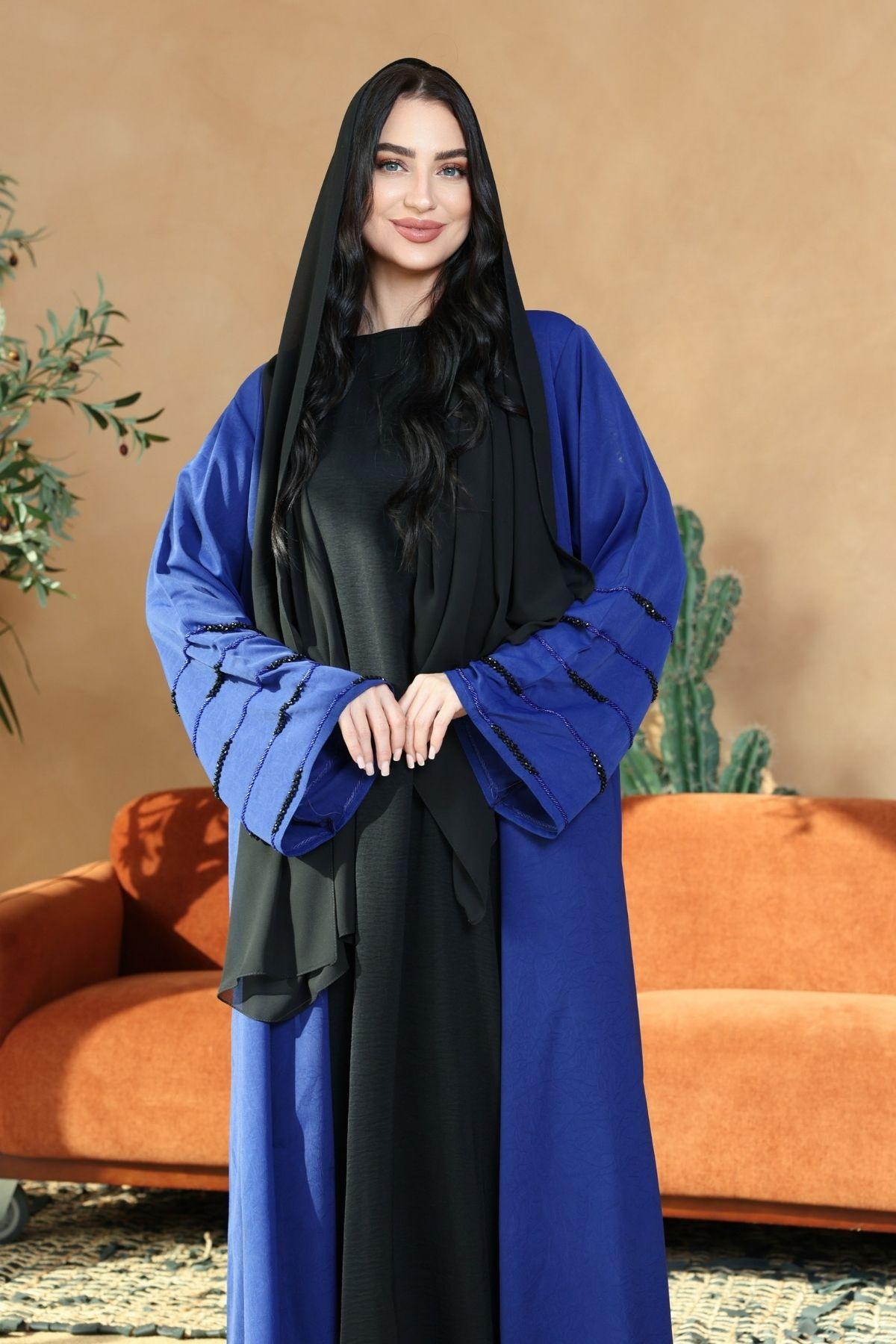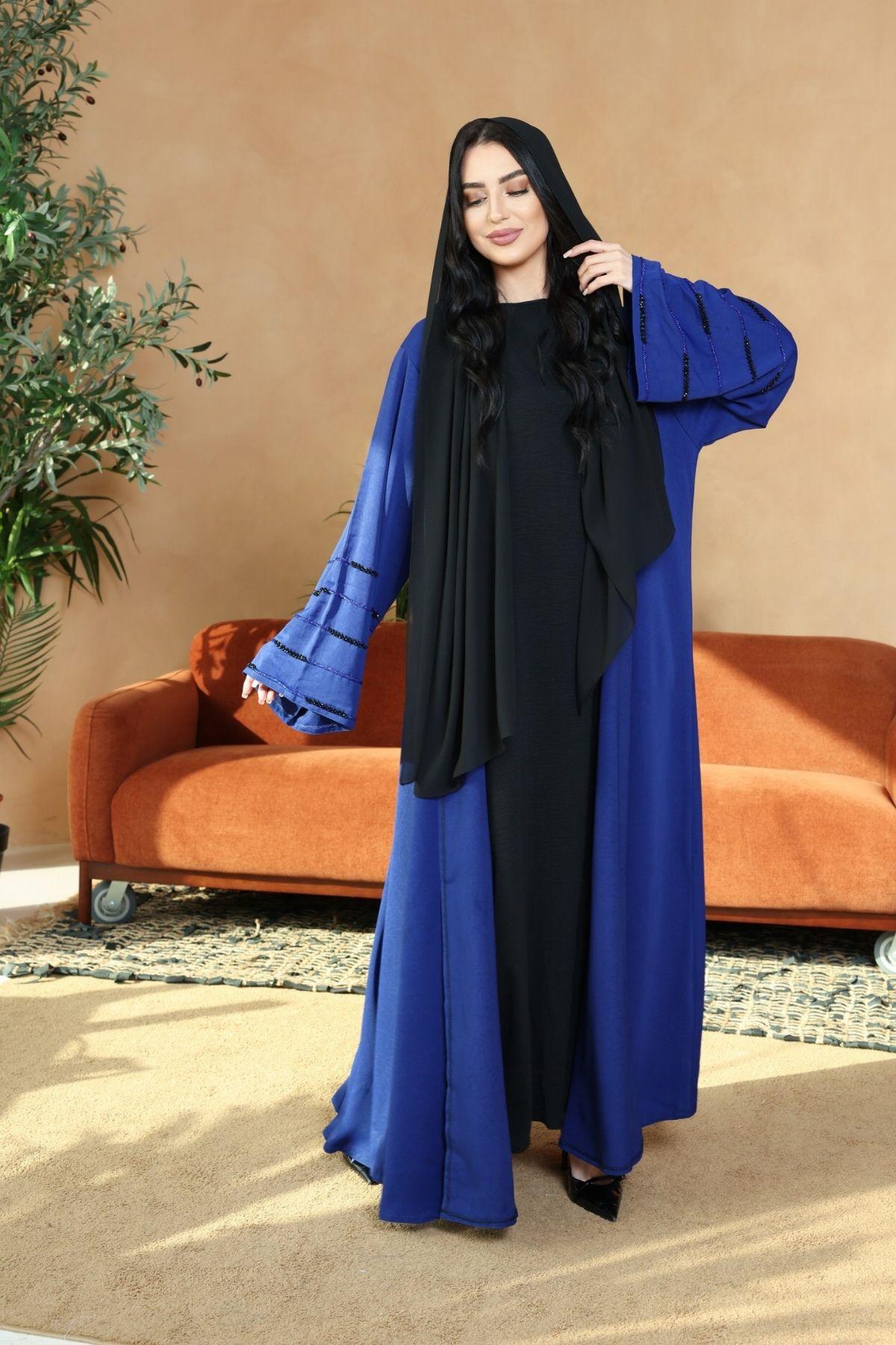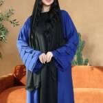 This luxurious Blue Ink abaya made in Luxury Korean Moss Crush fabric is perfectly paired with a black inner dress and matching black chiffon hijab, creating a look that’s modern, structured, and undeniably elegant. The deep black layers ground the rich blue tone, adding contrast and depth while keeping the outfit polished and editorial.